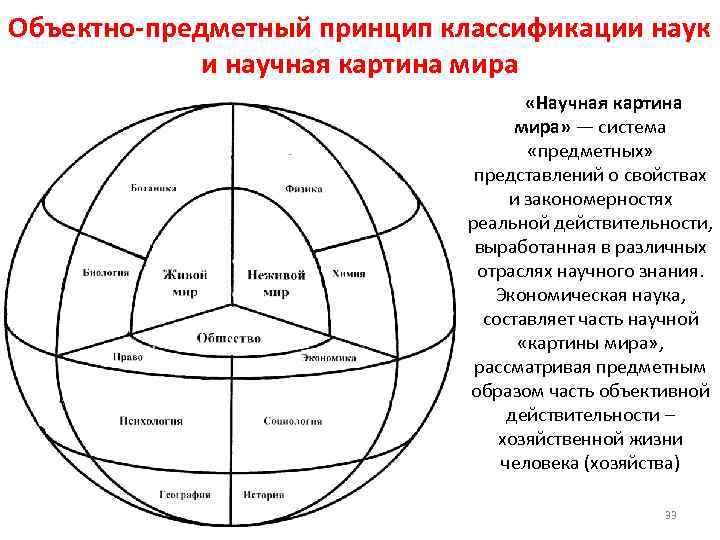 Объектно-предметный принцип классификации наук и научная картина мира «Научная картина мира» — система «предметных» представлений о свойствах и закономерностях реальной действительности, выработанная в различных отраслях научного знания. Экономическая наука, составляет часть научной «картины мира» , рассматривая предметным образом часть объективной действительности – хозяйственной жизни человека (хозяйства) 33
