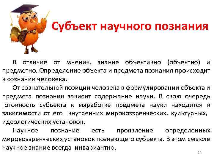 Субъект научного познания В отличие от мнения, знание объективно (объектно) и предметно. Определение объекта и предмета познания происходит в сознании человека. От сознательной позиции человека в формулировании объекта и предмета познания зависит содержание науки. В свою очередь готовность субъекта к выработке предмета науки находится в зависимости от его внутренних мировоззренческих, культурных, идеологических установок. Научное познание есть проявление определенных мировоззренческих установок познающего субъекта. В этом смысле научное знание всегда инвариантно. 34