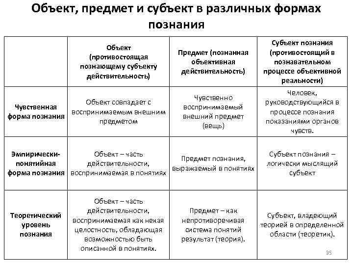 Объект, предмет и субъект в различных формах познания Объект (противостоящая познающему субъекту действительность) Объект совпадает с Чувственная воспринимаемым внешним форма познания предметом Предмет (познанная объективная действительность) Субъект познания (противостоящий в познавательном процессе объективной реальности) Чувственно воспринимаемый внешний предмет (вещь) Человек, руководствующийся в процессе познания показаниями органов чувств. Эмпирически. Объект – часть Предмет познания, понятийная действительности, выражаемый в понятиях форма познания воспринимаемая в понятиях Теоретический уровень познания Объект – часть действительности, воспринимаемая как некая целостность, обладающая возможностью быть описанной в понятиях. Предмет – как непротиворечивая система понятий результат (теория). Субъект познания – логически мыслящий субъект Субъект, владеющий теорией в определенной области (теоретик). 35