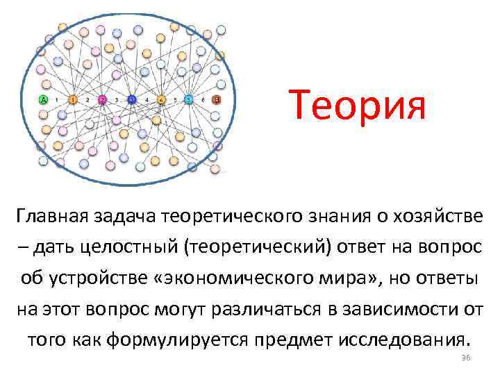 Теория Главная задача теоретического знания о хозяйстве – дать целостный (теоретический) ответ на вопрос об устройстве «экономического мира» , но ответы на этот вопрос могут различаться в зависимости от того как формулируется предмет исследования. 36