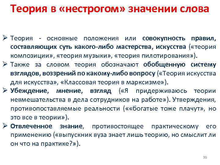 Теория в «нестрогом» значении слова Ø Теория - основные положения или совокупность правил, составляющих суть какого-либо мастерства, искусства ( «теория композиции» , «теория музыки» , «теория пилотирования» ). Ø Также за словом теория обозначают обобщенную систему взглядов, воззрений по какому-либо вопросу ( «Теория искусства для искусства» , «Классовая теория в марксизме» ). Ø Убеждение, мнение, взгляд ( «Я придерживаюсь теории невмешательства в дела сотрудников на работе» ). Утверждения, противопоставляемые реальности ( « «богатые тоже плачут» , но это все в теории» ). Ø Отвлеченное знание, противостоящее практическому его применению ( «выпускник вуза знает лишь теорию, но смыслит ли он что на практике? » ). 39