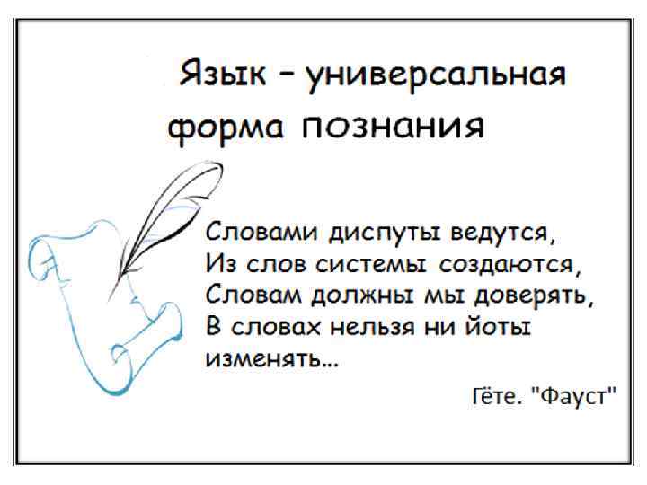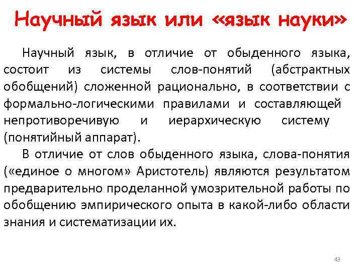 Научный язык или «язык науки» Научный язык, в отличие от обыденного языка, состоит из системы слов-понятий (абстрактных обобщений) сложенной рационально, в соответствии с формально-логическими правилами и составляющей непротиворечивую и иерархическую систему (понятийный аппарат). В отличие от слов обыденного языка, слова-понятия ( «единое о многом» Аристотель) являются результатом предварительно проделанной умозрительной работы по обобщению эмпирического опыта в какой-либо области знания и систематизации их. 43