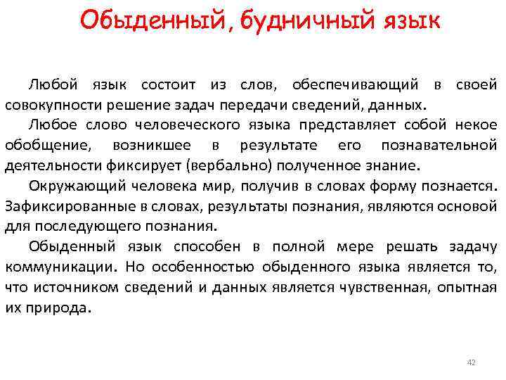 Обыденный, будничный язык Любой язык состоит из слов, обеспечивающий в своей совокупности решение задач передачи сведений, данных. Любое слово человеческого языка представляет собой некое обобщение, возникшее в результате его познавательной деятельности фиксирует (вербально) полученное знание. Окружающий человека мир, получив в словах форму познается. Зафиксированные в словах, результаты познания, являются основой для последующего познания. Обыденный язык способен в полной мере решать задачу коммуникации. Но особенностью обыденного языка является то, что источником сведений и данных является чувственная, опытная их природа. 42