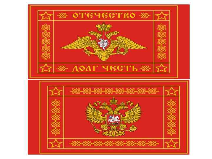 • Знамя Вооруженных сил, знамя Военно-морского флота, знамена иных видов Вооруженных сил Российской Федерации и знамена других войск являются официальными символами и воинскими реликвиями Вооруженных сил, Военно-морского флота, иных видов Вооруженных сил и других войск. Знамя Вооруженных сил состоит из полотнища, древка с навершием со скобой и подтоком. Полотнище знамени прямоугольное, красного цвета. Отношение ширины знамени к его длине 2: 3. Знамя Военно-морского флота состоит из двустороннего полотнища, древка с навершием со скобой и подтоком. Полотнищем знамени Военно-морского флота является Военно-морской флаг Российской Федерации, представляющий собой белое прямоугольное полотнище, пересеченное синим диагональным (Андреевским) крестом. Отношение ширины флага к его длине 2: 3. Отношение ширины концов креста к длине флага 1: 10. Знамя Вооруженных сил и знамя Военно-морского флота вручаются Президентом Российской Федерации и хранятся соответственно в Генеральном штабе Вооруженных сил и Главном штабе Военно-морского флота. Знамя Вооруженных сил и знамя Военно-морского флота официально используются в порядке, определяемом Президентом Российской Федерации.