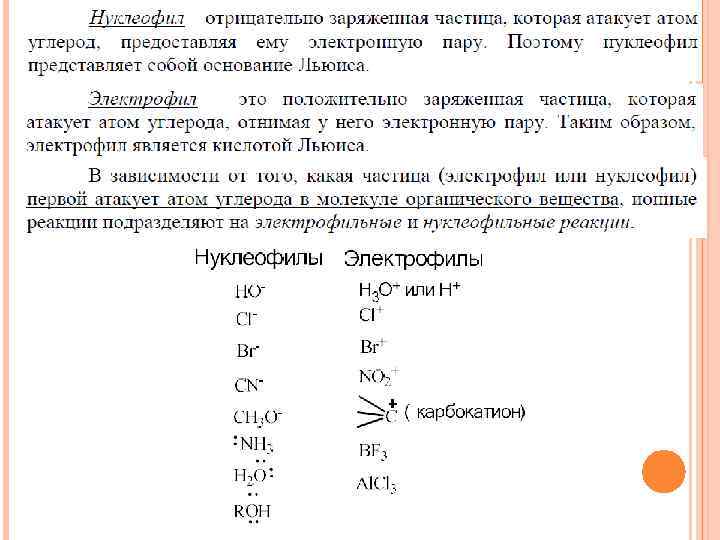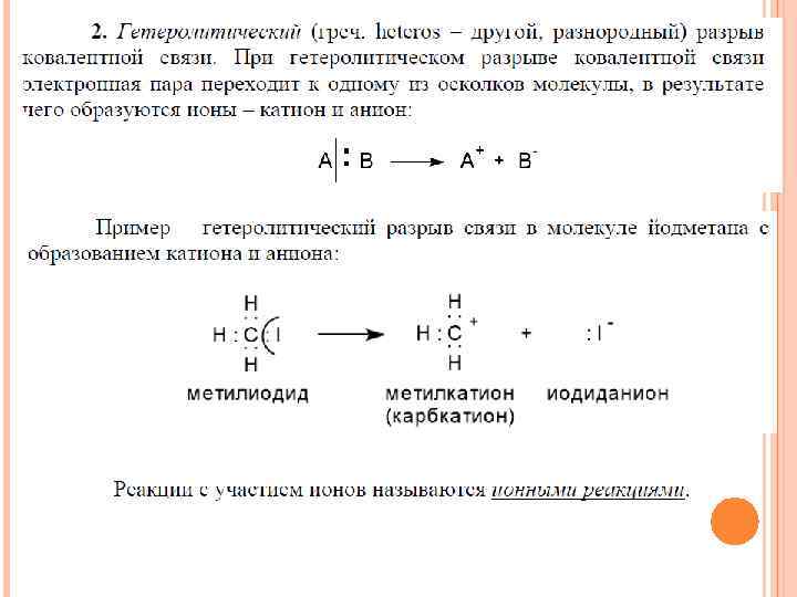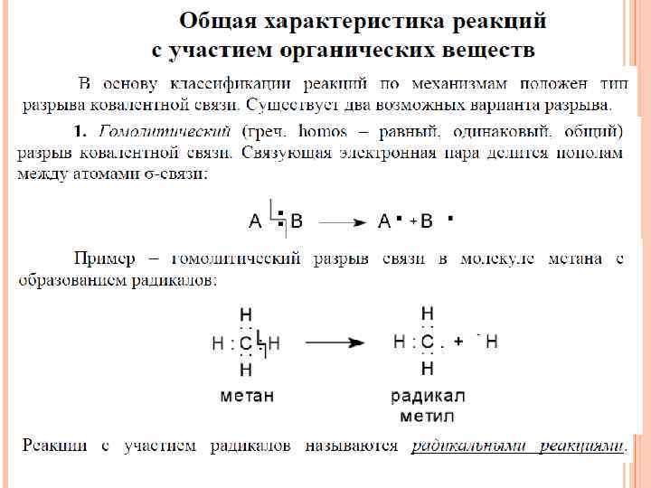 КЛАССИФИКАЦИЯ РЕАКЦИЙ И РЕАГЕНТОВ В ОРГАНИЧЕСКОЙ ХИМИИ Гомологический (радикальный) разрыв ковалентной связи: Из схемы видно, что при А: В А • + • В этом способе связывающая электронная пара делится радикалы пополам между партнерами связи. Гетеролитический (ионный) разрыв ковалентной связи: А: В При гетероциклическом взрыве А+ + (: В− ) связующая электронная пара целиком отходит к одному из партнеров, который приобретает ионы отрицательный заряд (-1).