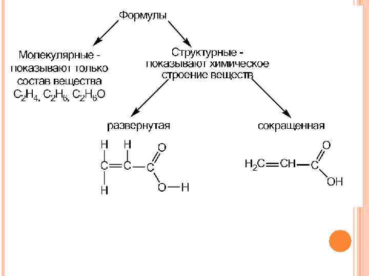 Виды химических формул Простейшая формула (эмпирическая формула) не обозначает реальных веществ, а только показывает соотношение числа атомов элементов в веществе. Эмпирической формуле СН отвечают несколько веществ: ацетилен С 2 Н 2, бензол С 6 Н 6, винилбензол С 8 Н 8. Молекулярная формула (или брутто-формула, истинная формула) отражает только качественный и количественный состав соединения. Н 2 О вода C 2 H 4 O 2 этановая кислота Ba. N 2 O 4 нитрит бария Рациональная формула. В рациональных формулах выделяются группы атомов, характерные для классов химических соединений. Н 2 О CH 3 СОOН Ba(NO 2)2 вода этановая кислота нитрит бария