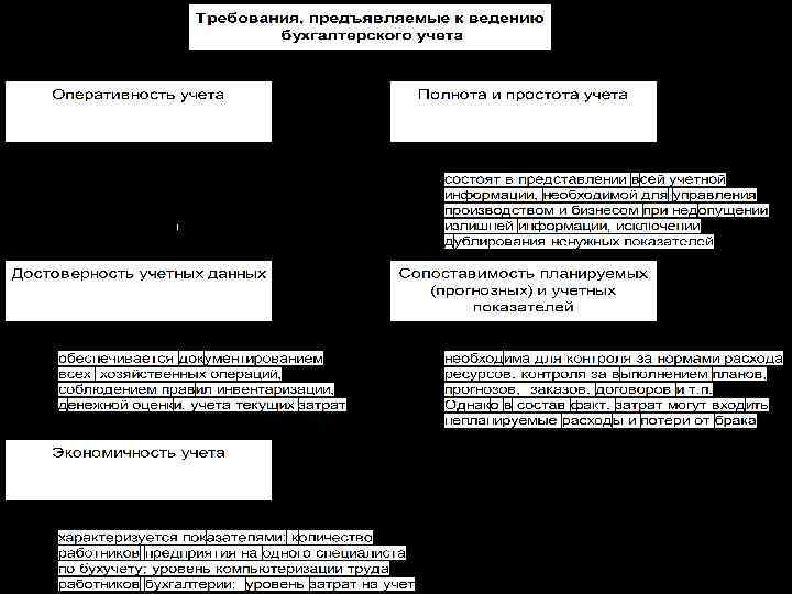 Требования согласно ПБУ 12008 • полнота отражения в бухгалтерском учете всех фактов хозяйственной деятельности (требование полноты); • своевременное отражение фактов хозяйственной деятельности в бухгалтерском учете и бухгалтерской отчетности (требование своевременности); • большую готовность к признанию в бухгалтерском учете расходов и обязательств, чем возможных доходов и активов, не допуская создания скрытых резервов (требование осмотрительности); • отражение в бухгалтерском учете фактов хозяйственной деятельности исходя не столько из их правовой формы, сколько из их экономического содержания и условий хозяйствования (требование приоритета содержания перед формой); • тождество данных аналитического учета оборотам и остаткам по счетам синтетического учета на последний календарный день каждого месяца (требование непротиворечивости); • рациональное ведение бухгалтерского учета, исходя из условий хозяйствования и величины организации (требование рациональности).