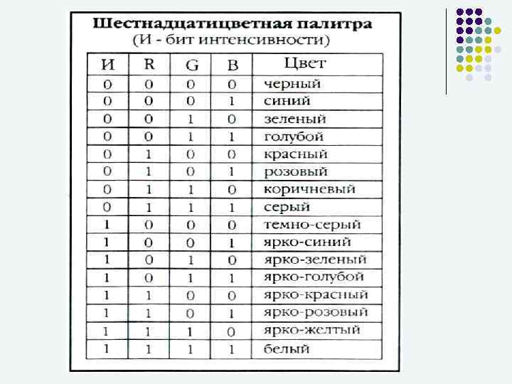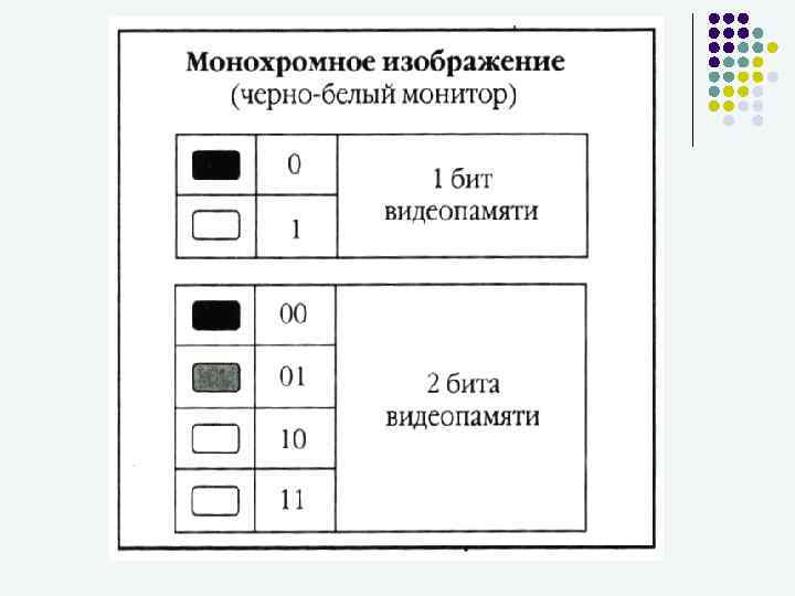 Растровое изображение может иметь различное разрешение, разрешение которое определяется количеством точек по горизонтали и вертикали Если изображение экранное, то точка называется пикселом. Стандартными счинаются: 640 Х 480, 800 Х 600, 1024 Х 768, 1200 Х 1024 и т. д. С размером изображения непосредственно связано его разрешение, оно измеряется в точках на дюйм (dots per inch – dpi). К примеру экран 15” монитора составляет 28 Х 21 см. При настройке экрана 800 Х 600 пикселов и учитывая, что 1”=25, 4 мм его разрешение составит 72 dpi. В простейшем случае (чернобелое изображение без градаций серого цвета). Каждая точка экрана может иметь лишь два состояния – «черная» или «белая» , т. е. для хранения ее состояния необходим 1 бит.