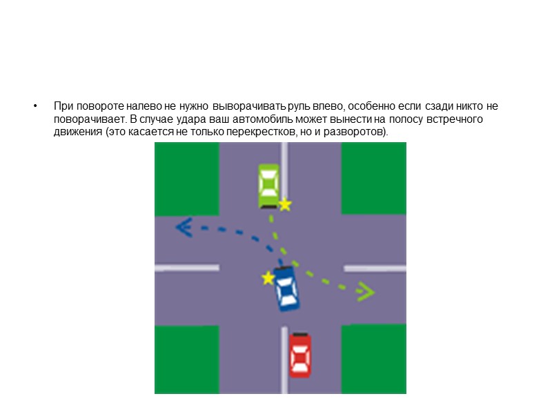 При повороте налево не нужно выворачивать руль влево, особенно если сзади никто не поворачивает. В случае удара ваш автомобиль может вынести на полосу встречного движения (это касается не только перекрестков, но и разворотов).