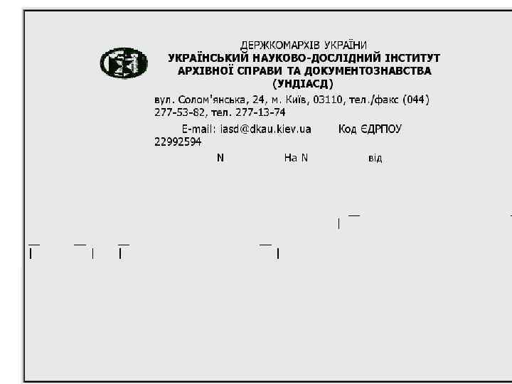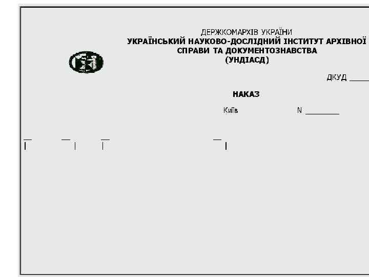 СКЛАД РЕКВІЗИТІВ ДОКУМЕНТІВ n n n 01 - зображення Державного Герба України, герба Автономної Республіки Крим 02 - зображення емблеми організації або товарного знака (знака обслуговування) 03 - зображення нагород 04 - код організації 05 - код форми документа 06 - назва організації вищого рівня 07 - назва організації 08 - назва структурного підрозділу організації 09 - довідкові дані про організацію 10 - назва виду документа 11 - дата документа 12 - реєстраційний індекс документа