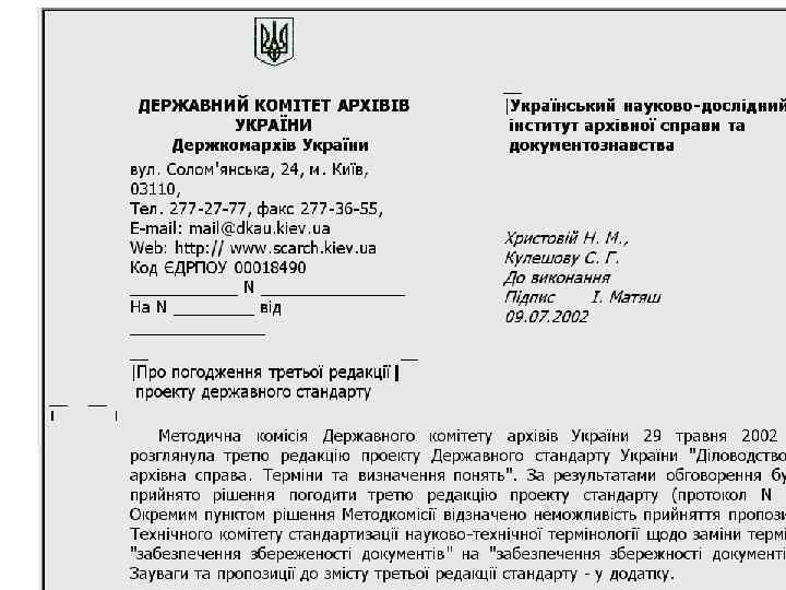 ДСТУ 4163 -2003 n n Цей стандарт поширюється на організаційно-розпорядчі документи - постанови, розпорядження, накази, положення, рішення, протоколи, акти, листи тощо, створювані в результаті діяльності: - органів державної влади України, органів місцевого самоврядування; - підприємств, установ, організацій та їх об'єднань усіх форм власності. Цей стандарт установлює: склад реквізитів документів; вимоги до змісту і розташовування реквізитів документів; вимоги до бланків та оформлювання документів; вимоги до документів, що їх виготовляють за допомогою друкувальних засобів.