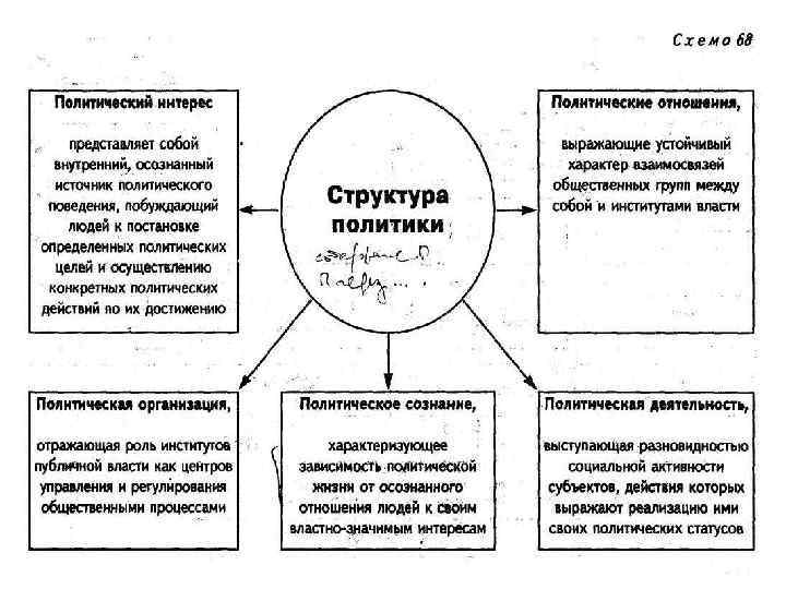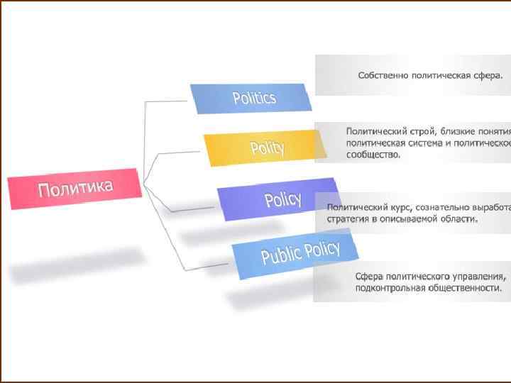 Структура политики Polity (полити, или полития) – политическая организация того или иного общества, государство в широком смысле этого слова, т. е. совокупность всех граждан страны, весь механизм осуществления власти. Иными словами, это политический строй, политический порядок в единстве составляющих его институтов и норм. Policy (полиси) – содержание, образ действий власти, правительства, технология принятия политических решений. Politics (политикс) – это политика, рассматриваемая с точки зрения возникновения и разрешения в ней конфликтов. Полити (форма), полиси (содержание) и политикс (процесс) нередко называют измерениями политики, отражающими ее важнейшие аспекты