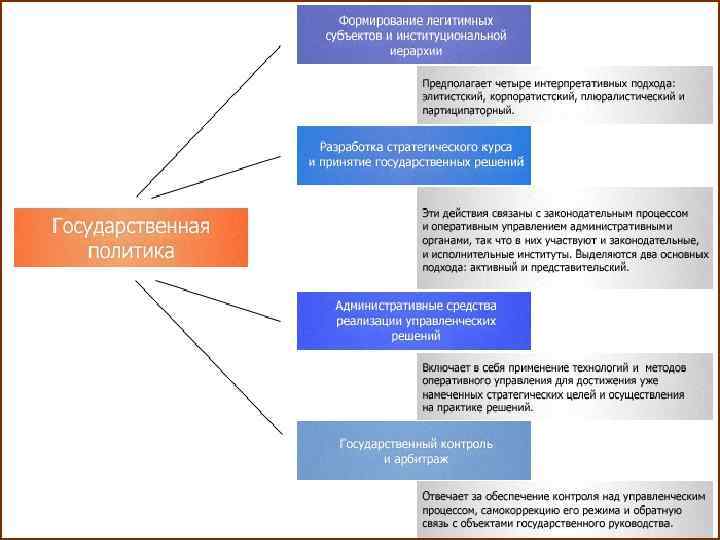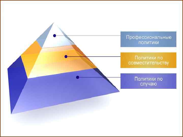 Структура политики 1. 2. 3. Форма политики – это ее организационная структура, институты (в том числе и система правовых и организационных норм), придающие ей устойчивость, стабильность и позволяющая регулировать политическое поведение людей. Форма политики воплощается в государстве, партиях и группах интересов, а также в законах, политических и правовых нормах. Содержание политики выражается в ее целях и ценностях, в проблемах, которые она решает, в мотивах и механизмах принятия политических решений; В политическом процессе отражается сложный, многосубъектный и конфликтный характер политической деятельности, ее проявление как отношений различных социальных групп, организаций и индивидов