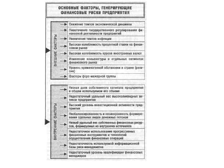 3. Причины риска являются отражением глубинных, коренных, всеобщих и необходимых отношений. Под фактором риска понимается определённая, качественно идентифицируемая характеристика экономической системы или её внешней среды, отражающая действующие силы либо условия, воздействующие на функционирование этой системы и способствующая проявлению причин риска.