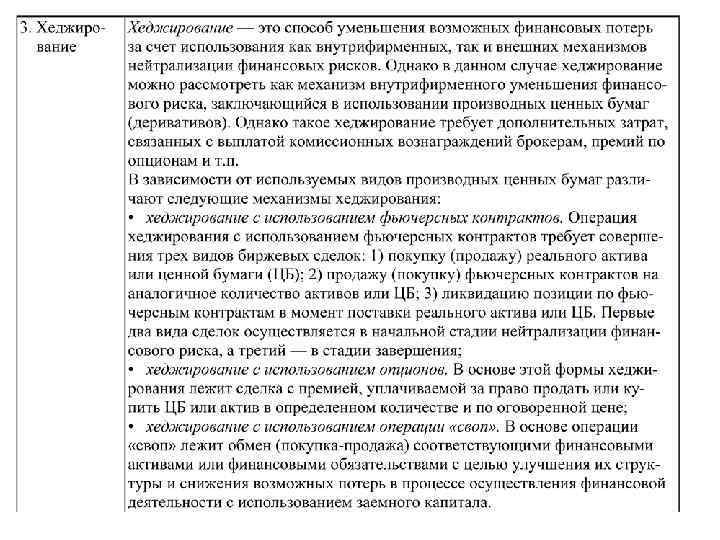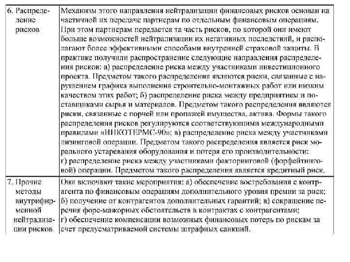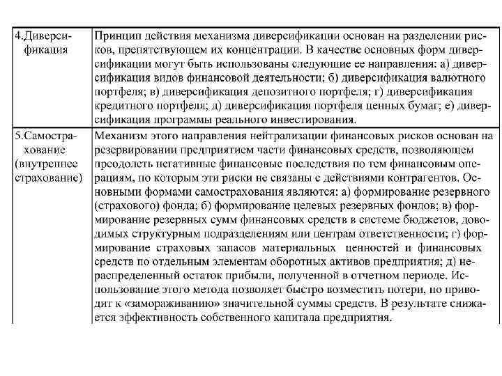 Основные внутрифирменные методы и приемы нейтрализации или уменьшения последствий воздействия финансовых рисков Методы Содержание основных методов 1. Избежание Является наиболее радикальным методом. Данный метод риска направлен на разработку системы мероприятий, которые полностью или практически полностью исключают финансовый риск. Однако необходимо учитывать, что полное избежание риска снижает вероятность получения высоких доходов. К числу таких мер относятся: • отказ от осуществления финансовых операций, уровень риска по которым чрезвычайно высок; • отказ от использования в больших объемах заемных средств; • отказ от использования в больших объемах активов в низколиквидных формах; • отказ от использования временно свободных денежных активов в краткосрочных финансовых вложениях.