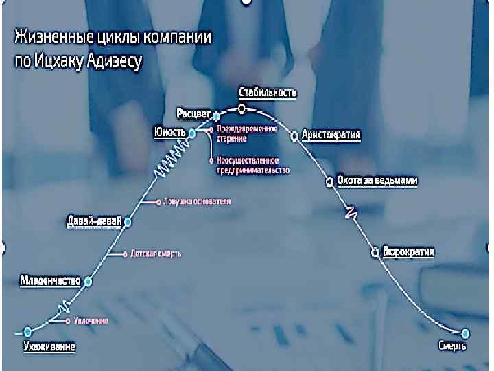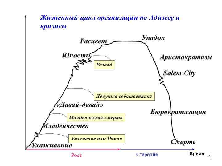 И последний одиннадцатый этап - «Смерть» Организационная смерть определяется как не хватка ресурсов для вознаграждения членов организации за работу. Организация мертва, когда никто не хочет хорошо работать — исчезла мотивация. Смерть случается, когда не остается людей, готовых принять на себя ответственность. А если нет политических или государственных сил, которые смогли бы поддержать слабеющую компанию, смерть может произойти перед этапом «Бюрократизация» . Таким образом, растущая организация проходит через не сколько стадий жизненного цикла, и каждой стадии присущи специфические черты структуры и системы контроля, свои особые цели и способы внедрения инноваций.