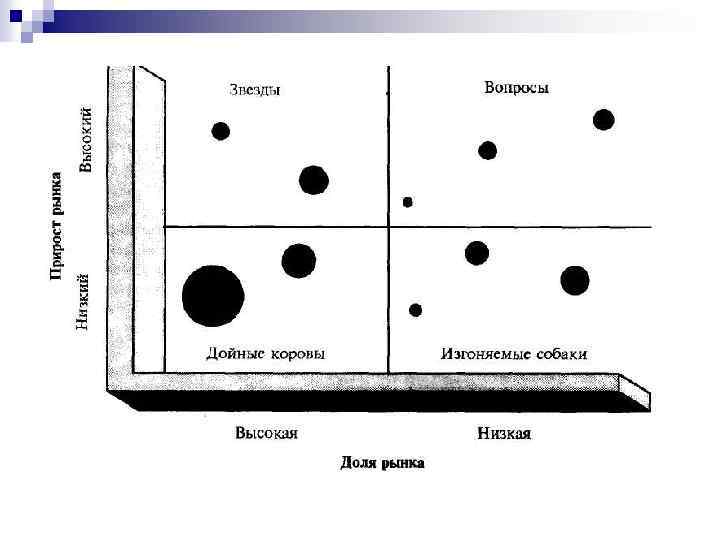Сюда относят новые направления деятельности, которые требуют вложения ресурсов, но пока мало дают отдачи. Часто это продуктынововведения, которые равновероятно могут стать и "звездами", и «собаками". n «Вопросы» . Оперируют на быстроразвивающемся рынке, но имеют низкую долю на нем