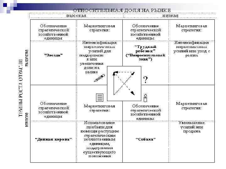 Подход Бостонской консалтинговой группы (BCG) Одна из ведущих консалтинговых групп по менеджменту — Бостонская консалтинговая группа — разработала матрицу, иллюстрирующую зависимость относительной доли входящего в компанию предприятия, которую она имеет на рынке, от темпов роста этого рынка