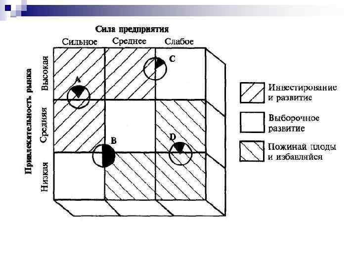 Каждое предприятие оценивается по двум главным параметрам: n привлекательности рынка; n конкурентной силе предприятия. Модель, предлагаемая GE, дает возможность увидеть большее количество факторов при оценке приблизительно равных предприятий, чем с помощью модели Бостонской группы.