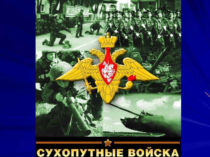 Структура Сухопутных войск В сухопутные войска Российской Федерации входят рода войск: • Мотострелковые войска, • Танковые войска, • Ракетные войска и артиллерия, • Войска ПВО Сухопутных войск, • Специальные войска и службы — совокупность войск и служб сухопутных войск, предназначенных для выполнения узкоспециальных операций по обеспечению боевой и повседневной деятельности вооруженных сил. Спецвойска сухопутных войск включают: • Разведывательные соединения и воинские части • Инженерные войск, • Войска РХБЗ, • Войска связи,