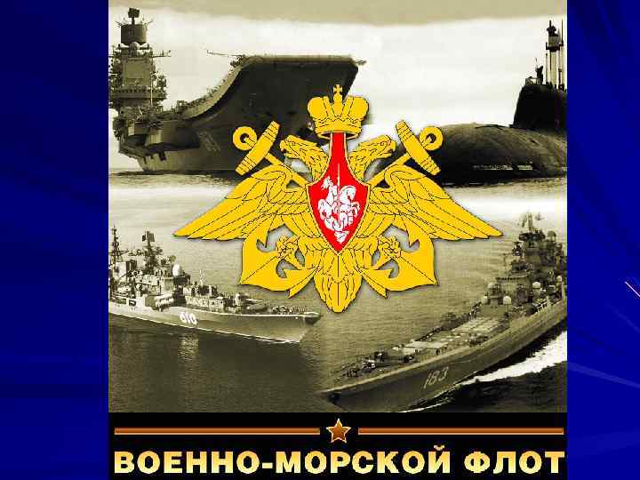 Военно-морской флот — является видом Вооруженных Сил Российской Федерации (ВС РФ). Он предназначен для вооруженной защиты интересов России, ведения боевых действий на морских и океанских театрах войны. ВМФ способен наносить ядерные удары по наземным объектам противника, уничтожать группировки его флота в море и базах, нарушать океанские и морские коммуникации противника и защищать свои морские перевозки, содействовать Сухопутным войскам в операциях на континентальных театрах военных действий, высаживать морские десанты, участвовать в отражении десантов противника и выполнять другие задачи.