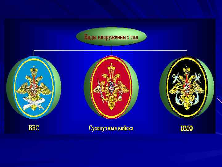 В состав Вооруженных Сил РФ входят: I. Виды ВС: Сухопутные войска; Военно-воздушные силы; Военно-морской флот. II. Отдельные рода войск: Войска Воздушно-космической обороны; РВСН; Воздушно-десантные войска.