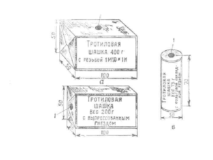 Промежуточный детонатор применяется для снаряжения инженерных и других типов боеприпасов и служит для надежной передачи детонации от капсюля детонатора к основному заряду ВВ. Для изготовления промежуточных детонаторов применяются тетрил, тэн, прессованный тротил. Для производства взрывных работ тротил, как правило, применяется в виде прессованных подрывных шашек: • больших — размерами 50 X 100 мм и весом 400 г; • малых — размерами 25 X 50 X 100 мм и весом 200 г; — буровых (цилиндрических) — длиной 70 мм, диаметром 30 мм и весом 75 г.