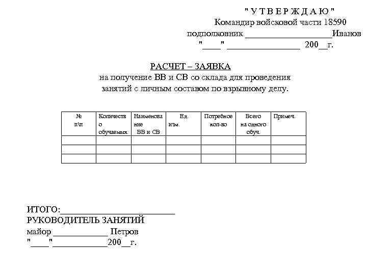 "УТВЕРЖДАЮ" Командир войсковой части 18590 подполковник __________Иванов "____" ________ 200__г. РАСЧЕТ – ЗАЯВКА на получение ВВ и СВ со склада для проведения занятий с личным составом по взрывному делу. № пп Количеств о обучаемых Наименова Ед. ние изм. ВВ и СВ ИТОГО: _____________ РУКОВОДИТЕЛЬ ЗАНЯТИЙ майор ______ Петров "________200__г. Потребное кол во Всего на одного обуч. Примеч.