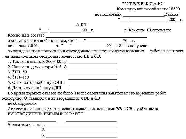 "УТВЕРЖДАЮ" Командир войсковой части 18590 подполковник __________Иванов "____" ________ 200__г. АКТ "___" _______ 20__г. г. Каменск–Шахтинский Комиссия в составе: _______________________ составила настоящий акт в том, что "___" ________ 20__г. по накладной № _______ от "___" ________ 20__г. было получено со склада части и полностью израсходовано при производстве взрывных работ на занятиях с личным составом следующие количество ВВ и СВ: 1. Тротил в шашках 200– 400 гр. ___________ 2. Капсюли–детонаторы № 8–А ___________ 3. ЗТП– 50 ___________ 4. ЗТП– 150 ___________ 5. Огнепроводный шнур ОШП ___________ 6. Детонирующий шнур ДШ ___________ Во время взрывов отказов не было. После окончания занятий место взрывных работ осмотрено. Оставшихся и не взорвавшихся ВВ и СВ не обнаружено. Акт составлен на предмет списания вышеперечисленных ВВ и СВ с учёта части. РУКОВОДИТЕЛЬ ВЗРЫВНЫХ РАБОТ _______________________ Члены комиссии: 1. ________________ 2. ________________ 3. ________________