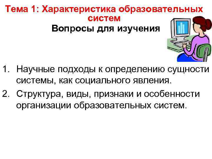 Тема 1: Характеристика образовательных систем Вопросы для изучения 1. Научные подходы к определению сущности системы, как социального явления. 2. Структура, виды, признаки и особенности организации образовательных систем.
