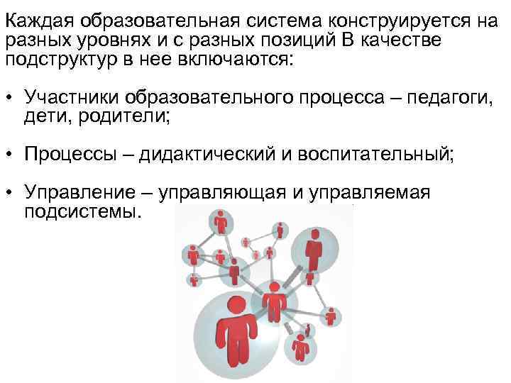 Каждая образовательная система конструируется на разных уровнях и с разных позиций В качестве подструктур в нее включаются: • Участники образовательного процесса – педагоги, дети, родители; • Процессы – дидактический и воспитательный; • Управление – управляющая и управляемая подсистемы.