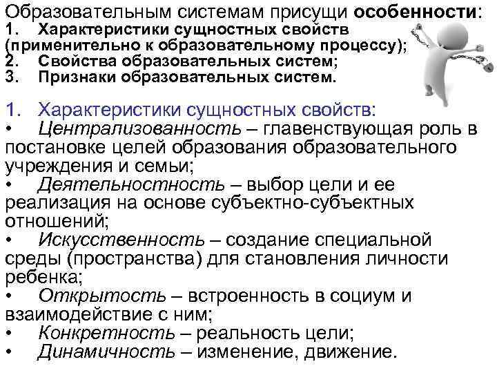 Образовательным системам присущи особенности: 1. Характеристики сущностных свойств (применительно к образовательному процессу); 2. Свойства образовательных систем; 3. Признаки образовательных систем. 1. Характеристики сущностных свойств: • Централизованность – главенствующая роль в постановке целей образования образовательного учреждения и семьи; • Деятельность – выбор цели и ее реализация на основе субъектно-субъектных отношений; • Искусственность – создание специальной среды (пространства) для становления личности ребенка; • Открытость – встроенность в социум и взаимодействие с ним; • Конкретность – реальность цели; • Динамичность – изменение, движение.