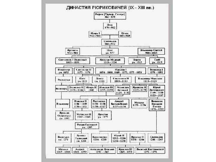Основные этапы развития Киевской Руси 1. Начальный Вторая половина IX – конец X вв. этап Рюрик (862 – 879) Олег (879 – 882) (882 – 912) Игорь (912 – 945) Ольга (945 – 964) Святослав Игоревич (964 – 972) 2. Расцвет Конец X – середина XI вв. Ярополк (972 – 980) Владимир I Красное Солнышко (980 – 1015) Святополк Окаянный (1015 – 1019) Ярослав I Мудрый (1019 -1054) 3. Упадок и распад на отдельные княжества Середина XI – начало XII вв. Изяслав (1054 – 1073) (1076 – 1078) Всеслав (1068 - 1069) Святослав (1073 – 1076) Всеволод (1078 – 1093) Святополк (1093 – 1113) Владимир Мономах (1113 – 1125) Мстислав (1125 – 1132)