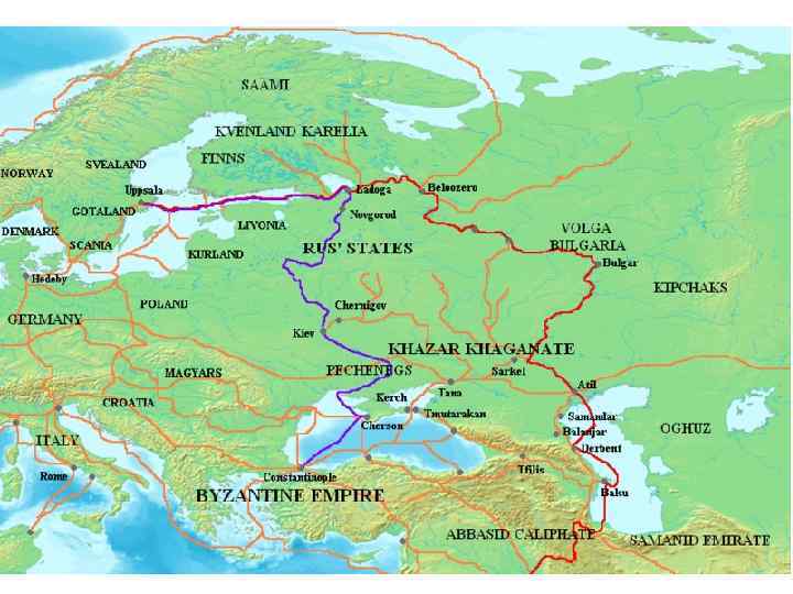 «Путь из варяг в греки» Водный путь из Скандинавии в Византию: от Финского залива по реке Неве в Ладожское озеро, далее по реке Волхов в озеро Ильмень(г. Новгород), далее по реке Ловать, затем мелкими речушками и «волоком» к верховьям Днепра (г. Смоленск) и по Днепру(г. Киев) в Черное море, затем в г. Царьград (г. Константинопль, г. Стамбул)