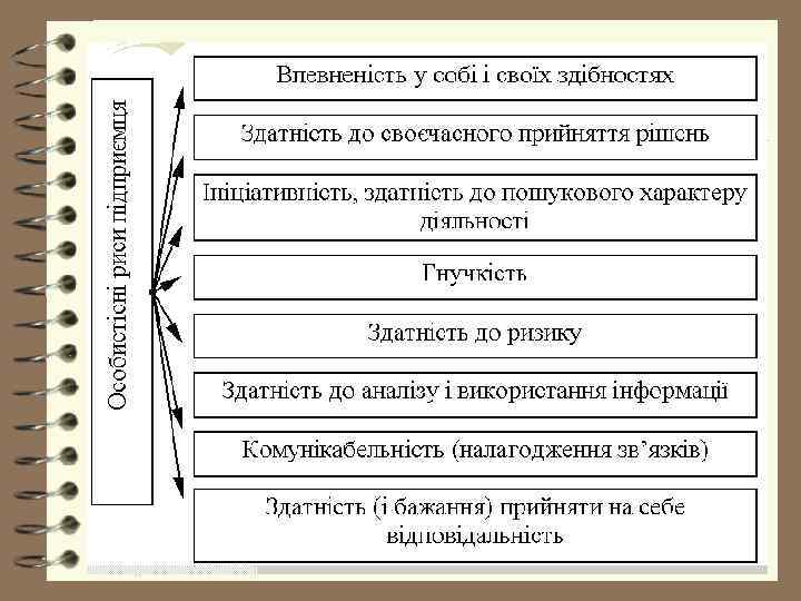 “Підприємницький потенціал особистості” 4 Визначено три групи факторів, які значною мірою впливають на результат майбутньої діяльності людини, що планує відкрити свою справу: 4 особисті якості; 4 ділові навички; 4 здатність приносити необхідні жертви заради втілення свого задуму в життя.
