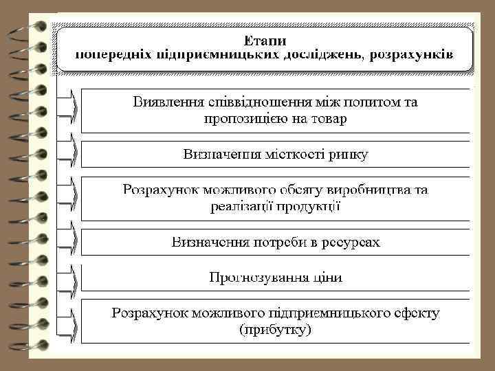 4 Оцінка ідеї на реальність втілення виконується самим підприємцем або експертом через використання попередніх даних про ситуацію на ринку пропонованого товару, очікуваної ціни, власних витрат та можливого ефекту. 4 Підприємницькі розрахунки виконуються з метою обґрунтування підприємницького рішення на базі проведення попередніх досліджень та розрахунків: