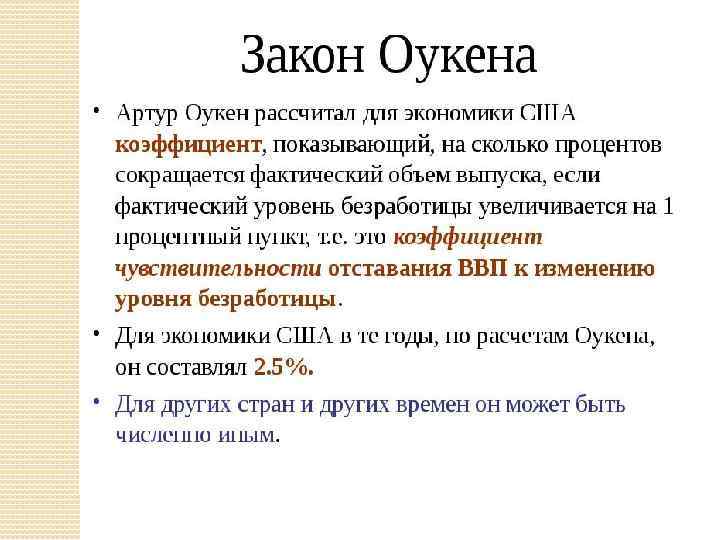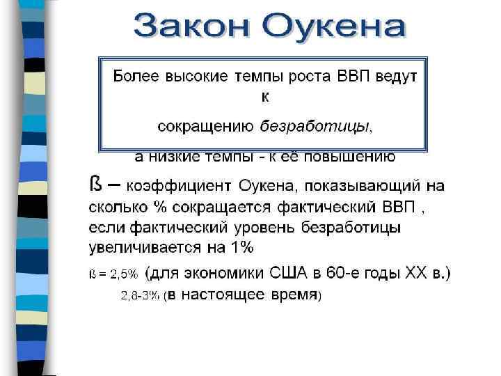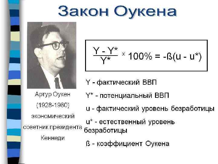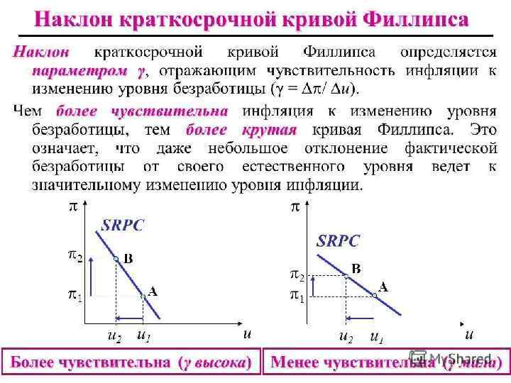 МОДИФИЦИРОВАННЫЙ ВАРИАНТ КРИВОЙ ФИЛЛИПСА График кривой строится в координатах π - уровень инфляции; U - уровень безработицы. При этом есть точка Un , в которой уровень безработицы равен естественному, а инфляция отсутствует. Если уровень безработицы ниже естественного, то в стране будет наблюдаться инфляционный рост цен. Если уровень безработицы будет выше естественного, то в стране будет иметь место дефляция.