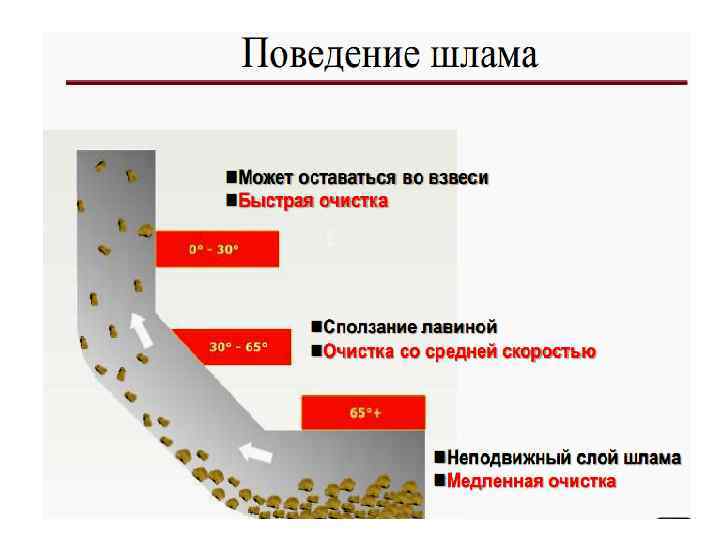 Подъем (удаление) шлама зависит от : - зенитного угола; - скорости восходящего потока (средняя и местная); -реологии; -плотности жидкости; -вращения КНБК; -объемной скорости формирования шлама у долота (диаметр долота, скорость проходки); -длины интервалов профиля; -эксцентриситета в размещении КНБК в стволе скважины; -размера частиц шлама (эквивалентный диаметр); -формы частиц шлама (диск, сфера); -эквивалентной плотности частиц шлама; -распределения шлама в затрубном пространстве; -наличия или отсутствия тенденции к агломерированию частиц шлама.