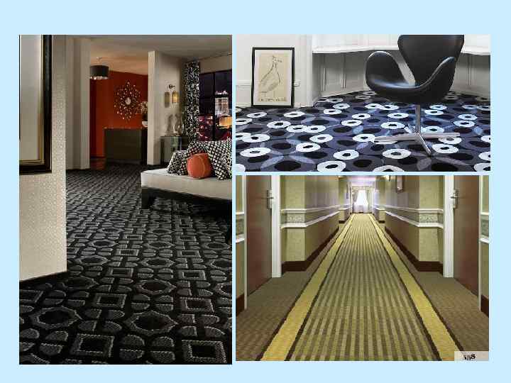 Ковровые покрытия Ковры - являются разновидностью ковровых покрытий и представляют собой законченное обработанное (оверлок по периметру) изделие со сложным (классика, гобелены, портреты, флористика) либо простым (абстракция) дизайном (рисунком). Ковры могут быть произведены как тафтинговым так и тканым способом. Ковролин - ковровое покрытие, которое представляет собой рулонный материал с необработанными краями. Структура коврового покрытия 1. Ворс; 2. Первичная основа; 3. Закрепляющий слой; 4. Вторичная основа: натуральный джут; искусственный джут; латексная резина; латекс; войлок искусственный; войлок натуральный