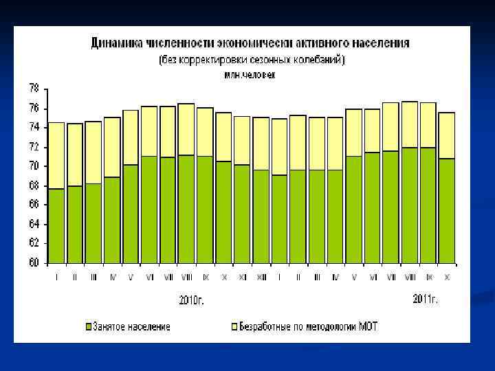 Уровень безработицы, % 12. 0 10. 6 9. 0 10. 0 7. 9 8. 0 8. 2 7. 8 8. 4 7. 2 6. 1 7. 5 6. 3 6. 0 4. 0 2. 0 0. 0 2001 2002 Российская Федерация 2003 2004 2005 2006 2007 2008 2009 2010
