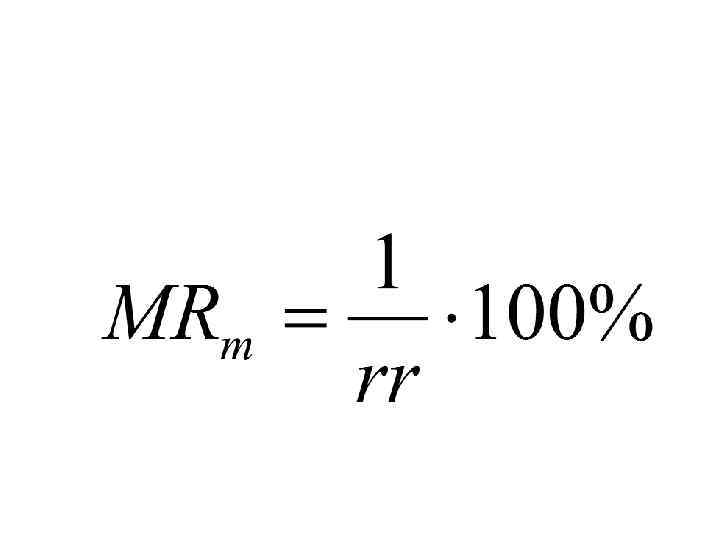 Общее количество вновь созданных денег равно величине первоначального избыточного резерва (800), умноженного на денежный мультипликатор (5). Денежный мультипликатор (MRm ) — коэффициент, характеризующий степень возрастания денежной массы в результате прироста избыточных резервов. Он равен единице, деленной на норматив резервных требований (rr):