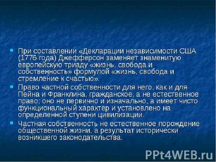 Декларация независимости делится на две части. В первой, так называемой социально-философской части, определялись социальный идеал и провозглашались государственно-правовые принципы независимости: 1) все люди равны и обладают такими неотъемлемыми правами, как право на жизнь, свободу и стремление к счастью; 2) для обеспечения этих прав учреждают правительства; 3) «если же данная форма правительства становится гибельной для этой цели, то народ имеет право изменить или уничтожить её и учредить новое правительство, основанное на таких принципах и с такой организацией власти, какие, по мнению этого народа, всего более могут способствовать его безопасности и счастью»