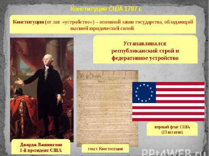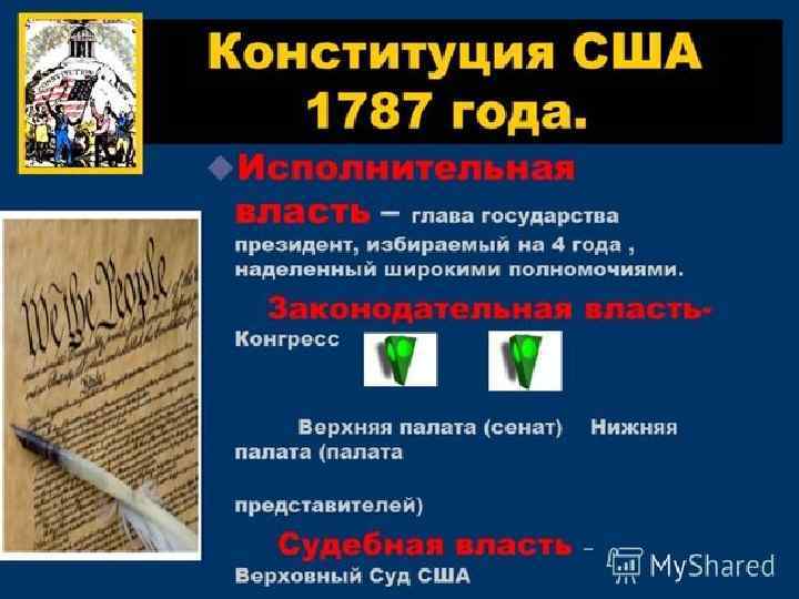 Президент, являясь одновременно главой государства и правительства, был наделён широкими полномочиями, а именно: - назначал всех высших федеральных должностных лиц, членов правительственного кабинета, послов, консулов и членов Верховного суда США и других должностных лиц с «совета и согласия сената» ; - являлся главнокомандующим армией и флота США; - заключал международные договоры; - обладал правом помилования, за исключением «импичмента» .