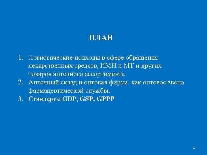 ПЛАН 1. Логистические подходы в сфере обращения лекарственных средств, ИМН и МТ и других товаров аптечного ассортимента 2. Аптечный склад и оптовая фирма как оптовое звено фармацевтической службы. 3. Стандарты GDP, GSP, GPPP 2