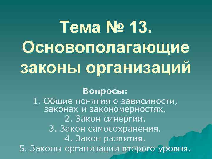 Тема № 13. Основополагающие законы организаций Вопросы: 1. Общие понятия о зависимости, законах и закономерностях. 2. Закон синергии. 3. Закон самосохранения. 4. Закон развития. 5. Законы организации второго уровня.