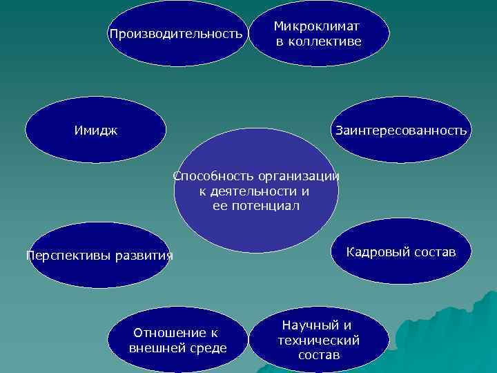Микроклимат Производительность в коллективе Имидж Заинтересованность Способность организации к деятельности и ее потенциал Перспективы развития Кадровый состав Научный и Отношение к технический внешней среде состав
