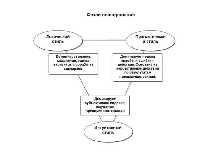 Подходы к планированию • «Сверху-вниз» . План представляет собой детально расписанный взгляд руководства на то, какими путями идти и каких результатов можно добиться. Персонал вовлечен только в процесс последующего выполнения плана. Самый быстрый, простой и дешевый, этот подход в то же время нарушает моральный климат в коллективе. С ростом размеров компании уменьшается реалистичность планов (в сторону завышения). • «Снизу-вверх» . Самый демократичный подход, основывается на прогнозах и планах низового персонала, консолидированных в общий план компании. Данный подход весьма трудоемкий и продолжительный по времени. Планы, скорее всего, занижены и не позволяют достигать новых, больших целей. • Комбинированный подход ( «цели вниз, планы вверх» ). Попытка компенсировать недостатки предыдущих двух подходов. План составляется на основе устранения расхождения между целями, определенными руководством и оценкой линейного персонала. Всегда является компромиссом и результатом согласований, поэтому требует значительных временных и трудовых затрат.