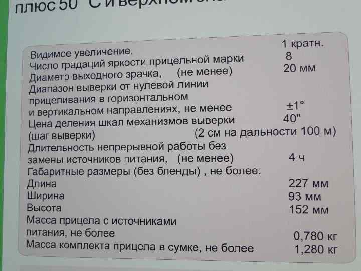 Прицел коллиматорный ночной ПКН-03 М-01 (далее прицел) предназначен для ориентации на местности и ведения прицельной стрельбы из автоматов АК-74, АКМ и их модификаций при естественной освещенности от луны и звезд , а также при полной темноте с использованием инфракрасного оптического модуля АГИ-14 -1/4 (далее осветитель). прицел позволяет быстро и точно навести оружие на цель и произвести выстрел в различных условиях метеорологической обстановки при температуре воздуха от -50 до +50 градусов. Особенностью прицела является применение активной красной точки. ТТХ Видимое увеличение 2, 9* Угловое поле зрения 9 град. Дальность видения ростовой фигуры человека: в пассивном режиме (без подсветки) при нормальных условиях – 350 м. в активном режиме (с подсветкой встроенным осветителем) - 200 м. Напряжение питания 3 в. Количество элементов питания 2 Диапазон расхода выверки по горизонту и вертикали + 34 (+ 0 -10) Масса 1, 4 кг.