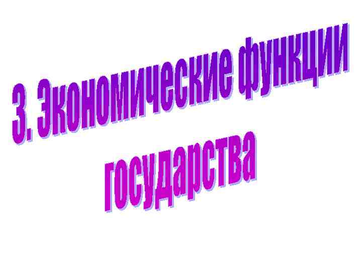 Экономические функции государства: 1. Охрана территорий. 2. Обеспечение общественного порядка. 3. Проведение активной внешнеэкономической политики. 4. Обеспечение институционально-правовой деятельности экономических агентов. 5. Проведение активной внутренней экономической политики. 6. Государственное регулирование экономики. 7. Государственное программирование экономики. 8. Компенсация негативных внешних эффектов рыночного поведения. 9. Удовлетворение потребностей в общественных товарах. 10. Перераспределение доходов и социальная защита. 11. Государственное предпринимательство.