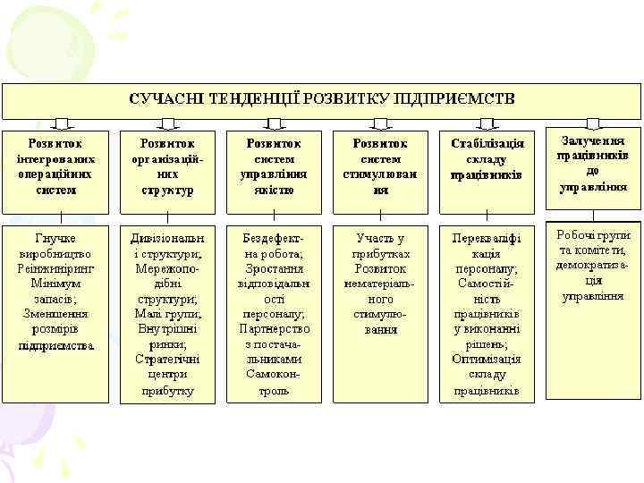 1. Сучасні тенденції розвитку підприємств • Розвиток підприємства означає якісні зміни та оновлення його господарської системи та організаційної структури, підвищення ефективності функціонування на основі вдосконалення техніки, технології та організації праці, підвищення якості продукції та послуг